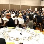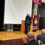 宴たけなわ頃、舞台では恒例の「大会旗の継承式」が行われ、大会旗は相模原・大和稲門会から2025年の主管を務められる鎌倉稲門会の兵藤会長に引き継がれました。兵藤会長からは来年開催に向けた抱負が述べられました。