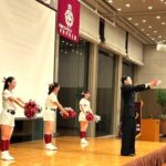 料理はビュッフェ方式で、参加者全員が料理を取りテーブルに収まるにつれ、会場内のあちらこちらで談笑が広がってきました。アトラクションとして、応援部のチア―リーダによる演技の会場は盛り上がりました。